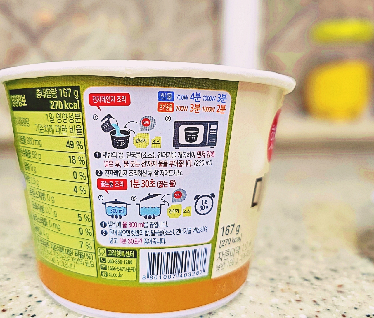 1. 햇반의 밥, 밑 국물 소스, 건더기를 개봉하여 먼저 컵에 넣습니다.