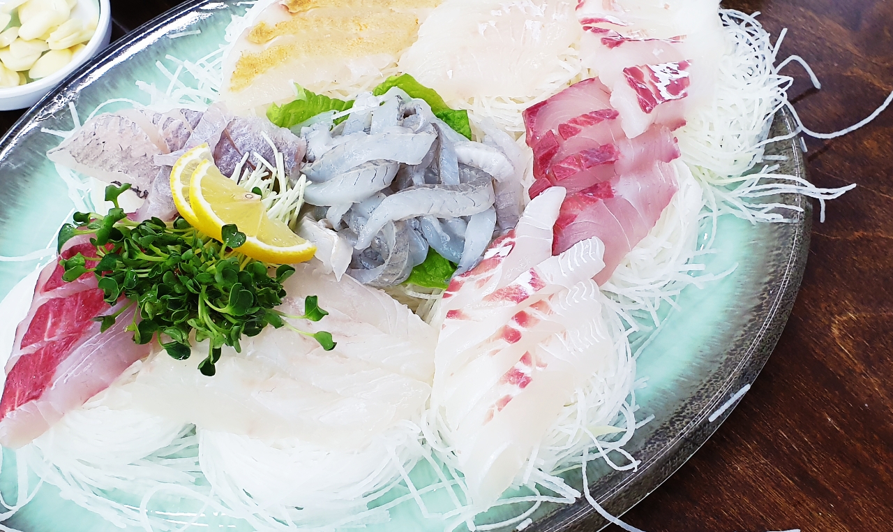 참치회 , 모듬회 , 부시리, 연어 , 황금광어, 참돔 등 다양하게 있어요 .