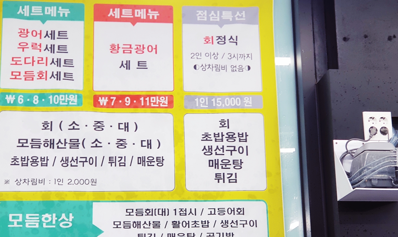 세트메뉴 △ 도 있구요. 점심시간에 가면 2인 이상 상차림비용 없이 1인 15,000원에 회정식 먹을 수 있기도 합니다 .
