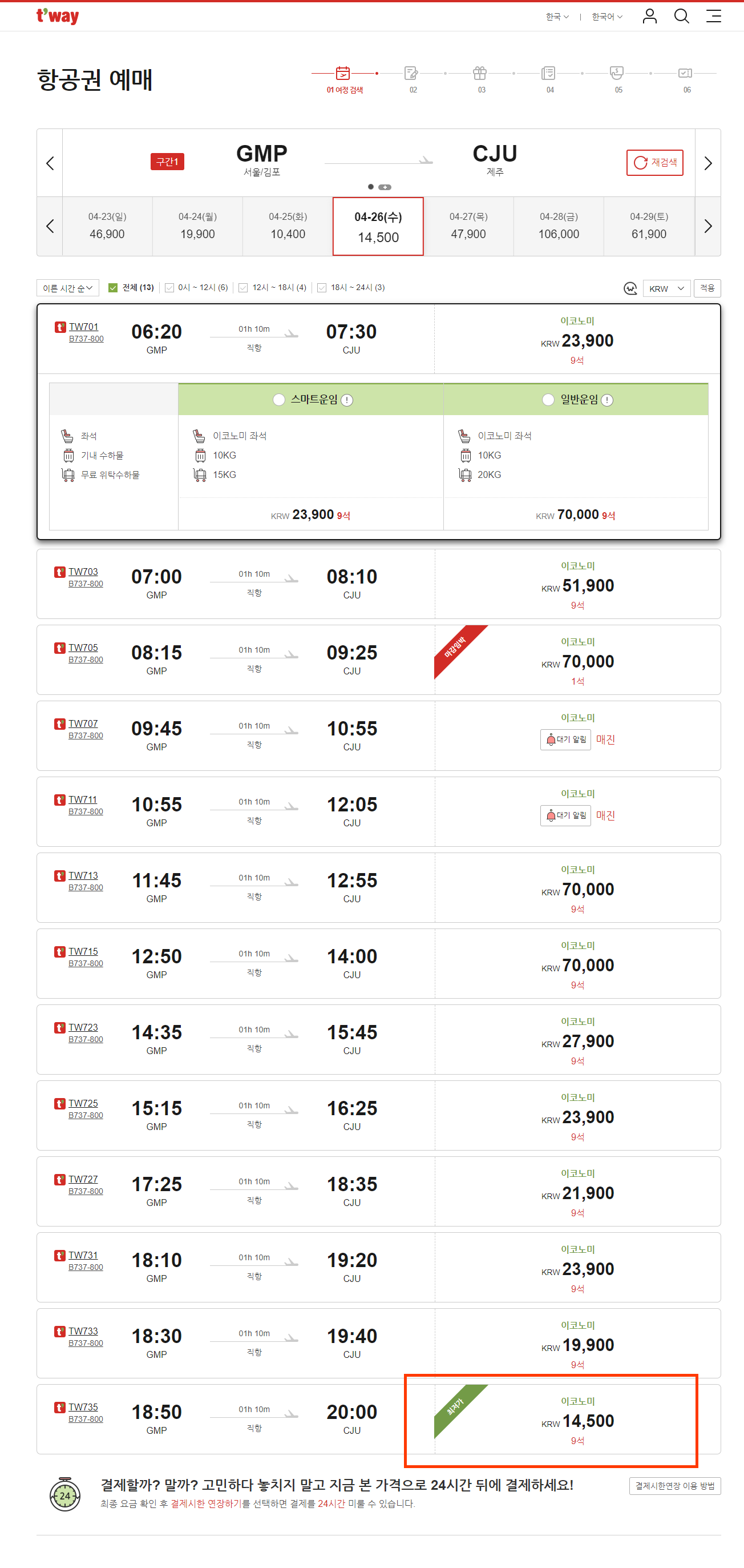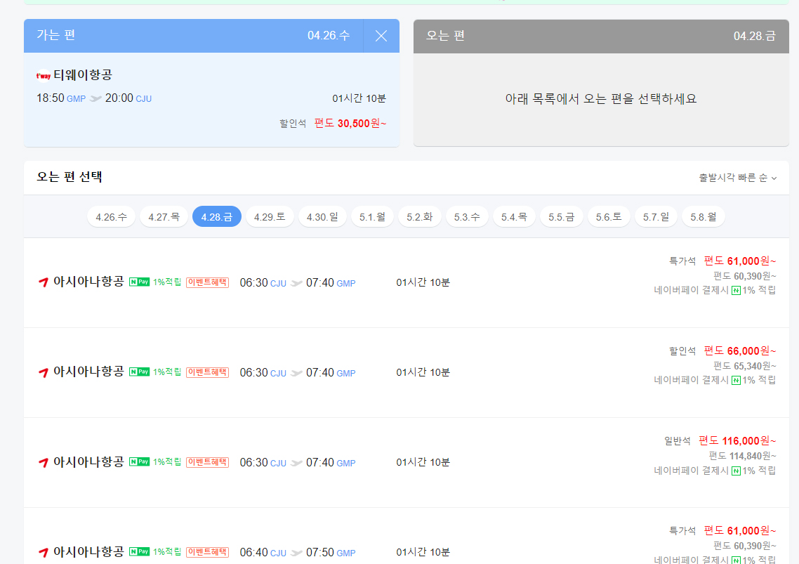 저는 4월 26일에 김포에서 출발하여 4월 28일에 다시 제주에서 김포로 돌아가는 일정을 클릭해보았습니다 .
