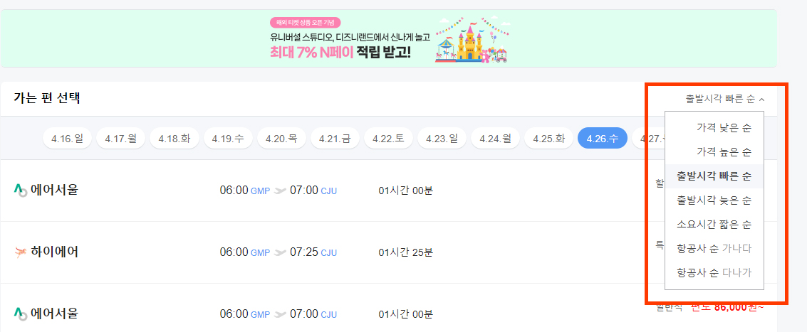 가운데 쪽에 보면 ' 출발시각 빠른순 및 항공사순, 가격 낮은순, 높은순이라는 탭이 보이실꺼예요 .