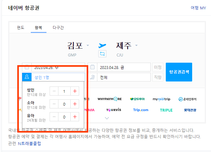 네이버항공권에서 보면 출발공항과 도착공항 그리고 날짜 및 인원을 선택하는 칸이 있습니다.