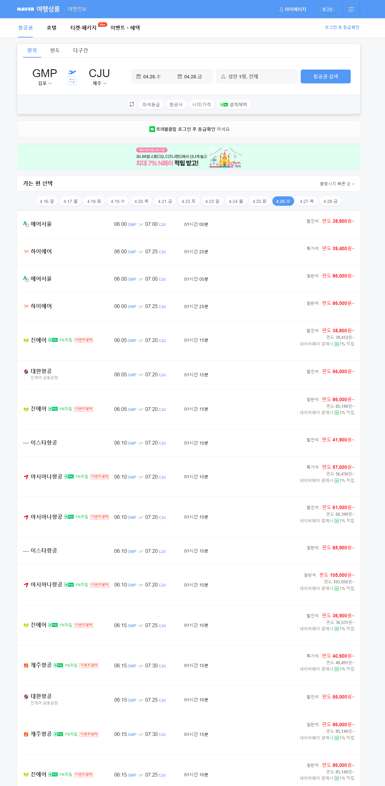 네이버항공권이랑 해당 항공사의 가격대를 잘 비교해보시면서 예약하시면 되겠습니다.^^