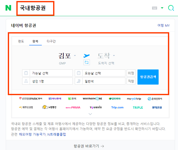 일단 저는 국내항공권이라고 네이버에서 검색을 합니다 .